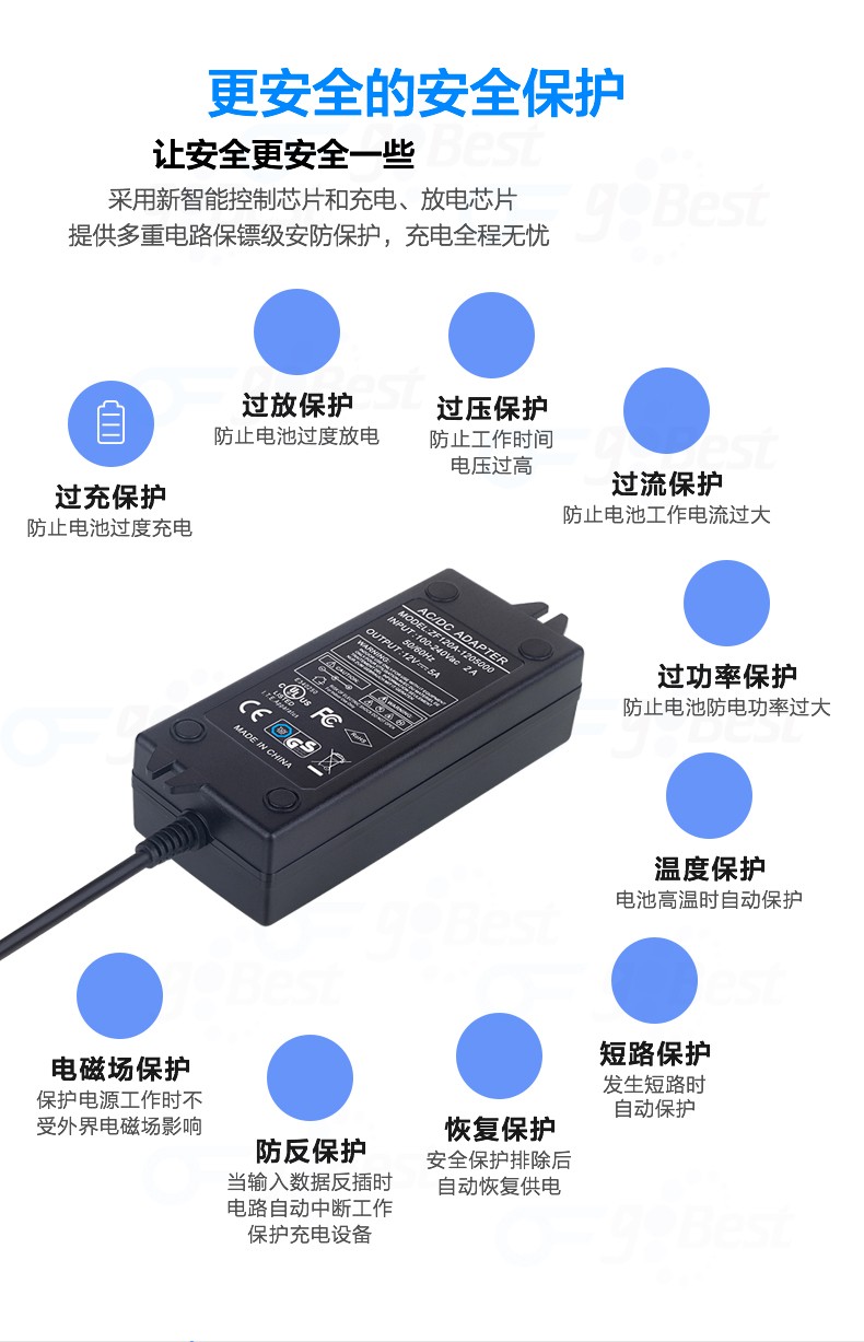 • 采用前沿IC控制方案和先進的制造工藝,高精度,低噪音;過壓,過流,過充,短路等多重保護。
