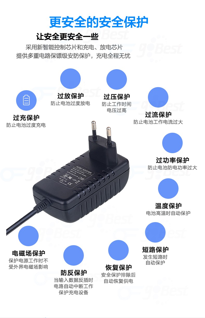 • 采用前沿IC控制方案和先進(jìn)的制造工藝,高精度,低噪音;過壓,過流,過充,短路等多重保護(hù)。