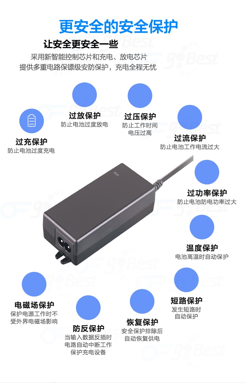 • 采用前沿IC控制方案和先進的制造工藝,高精度,低噪音;過壓,過流,過充,短路等多重保護。
