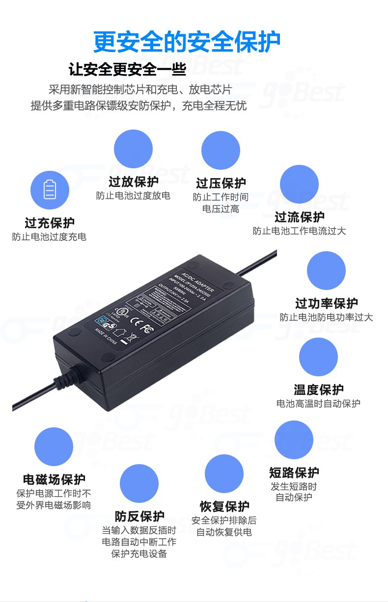 • 采用前沿IC控制方案和先進的制造工藝,高精度,低噪音;過壓,過流,過充,短路等多重保護。